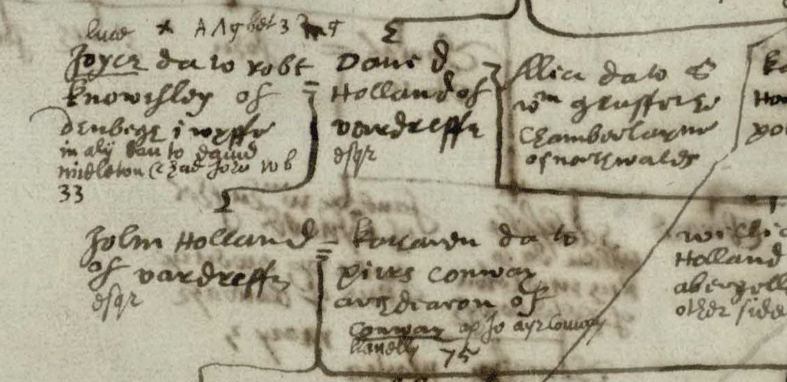 The Kinmel and Dinorben estates eventually went out of the Holland family due to lack of a male heir. Mary and Elizabeth, the daughters and co-heirs of David ap Piers ap David ap Piers ap John ap Dafydd ap Gruffudd, each inherited a portion of the estate which in turn went to their respective spouses William Price of Rhiwlas and Colonel John Carter, military ruler of Conwy Castle, in 1641 and 1647 respectively. Details of each of the main lines of descent from Gruffudd Holland are covered separately below. Several of the descendants held influential positions in Denbighshire and these are covered under the individuals in the evolving pedigree. There are various sources of pedigrees relating to this branch of the Holland family, these include The Visitations of Wales by Lewis Dwnn, The pedigrees of Anglesey and Caernarfonshire Families by J E Griffith, Powys Fadog, The Heart of Northern Wales by W Bezant Lowe, Y Cwtta Cyfarwydd and Welsh Genealogies AD1400-1500 by P C Bartrum; plus various miscellaneous pedigrees in the National Library of Wales (NLW). The Coed Coch papers in the NLW and the Kinmel papers in Bangor University archives are also a valuable source of data. Isabella, a great granddaughter of Gruffudd Holland, married Rhys ap Jenkin ap Llewelyn ap Thomas of Trofarth, from whence came the Wynne Family of Trovarth and Coed Coch.