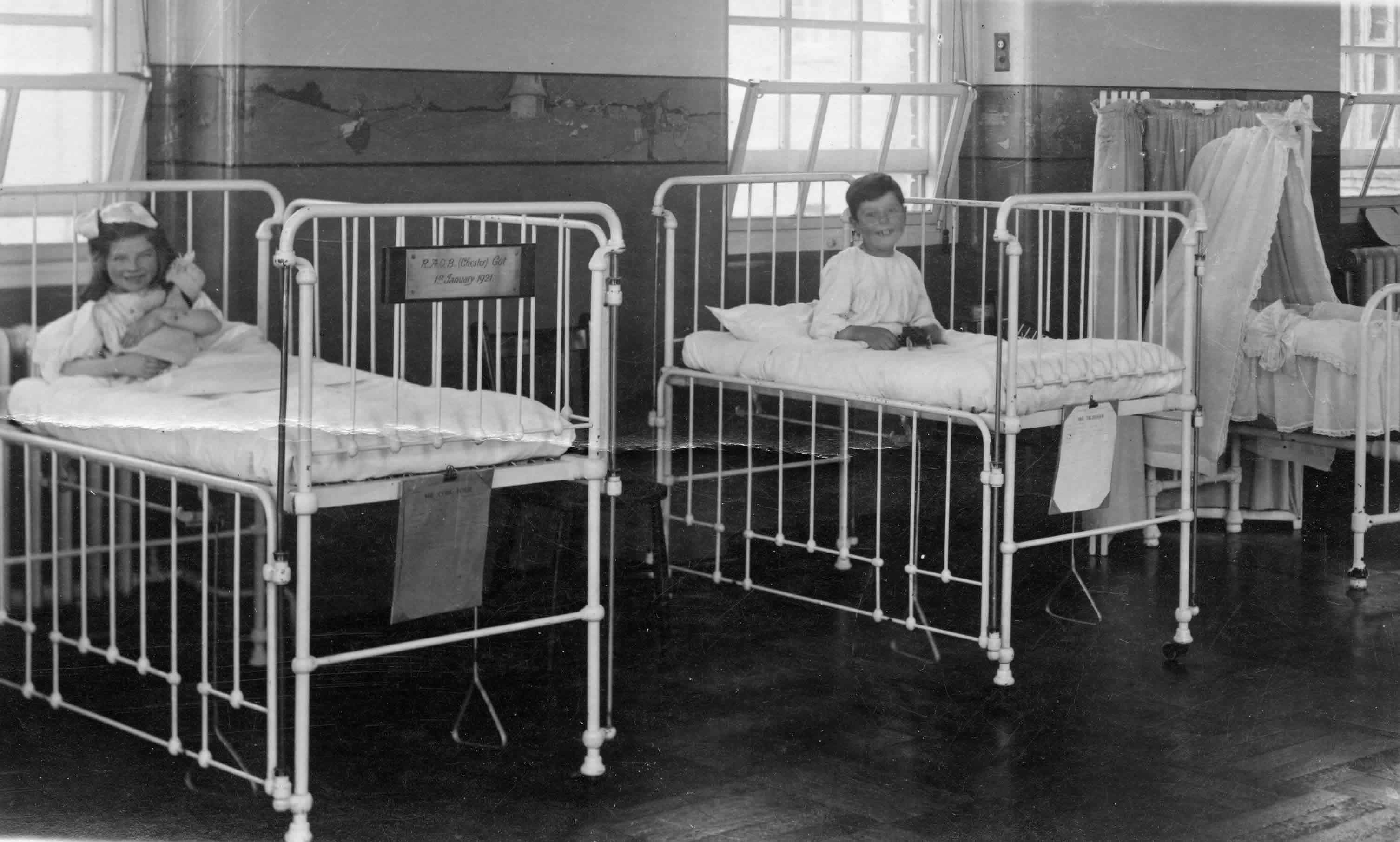 This picture is one of those that you wonder why it was taken and why it has survived all this time. The children are unknown but such is the quality of the original photo the records hanging on each bed reveal that the Doctors attending these two children were a Mr Cyril Dobie and Mr Trubshaw. The bed on the left has a plaque advising that the "Cot" was donated by the RAOB (Royal Antediluvian Order Of Buffaloes) in 1921. The spotless & highly polished wooden floor is a reminder of how hospitals used to be cleaned in the UK. The Hospital pictured is probably the Chester City Hospital which was demolished in the 1960's in favour of new housing. |