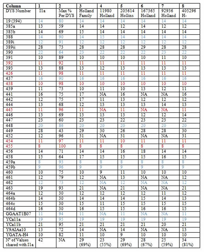 The number of shared STR values ranges between 23 (55%) in Column 4 to 34 (81%) in Column 8. This is sufficient to confirm the assumption that they share a common ancestor within the 11a timescale. At the present time there is no data available of DYS-STR values for any of the mutations shown on the Haplogroup I1 tree below I1a. If any such data should come available in the future then comparison with the values in the table below may give a more accurate assessment of the possible date of the common ancestor of the Hollands of Lancashire and N Wales.