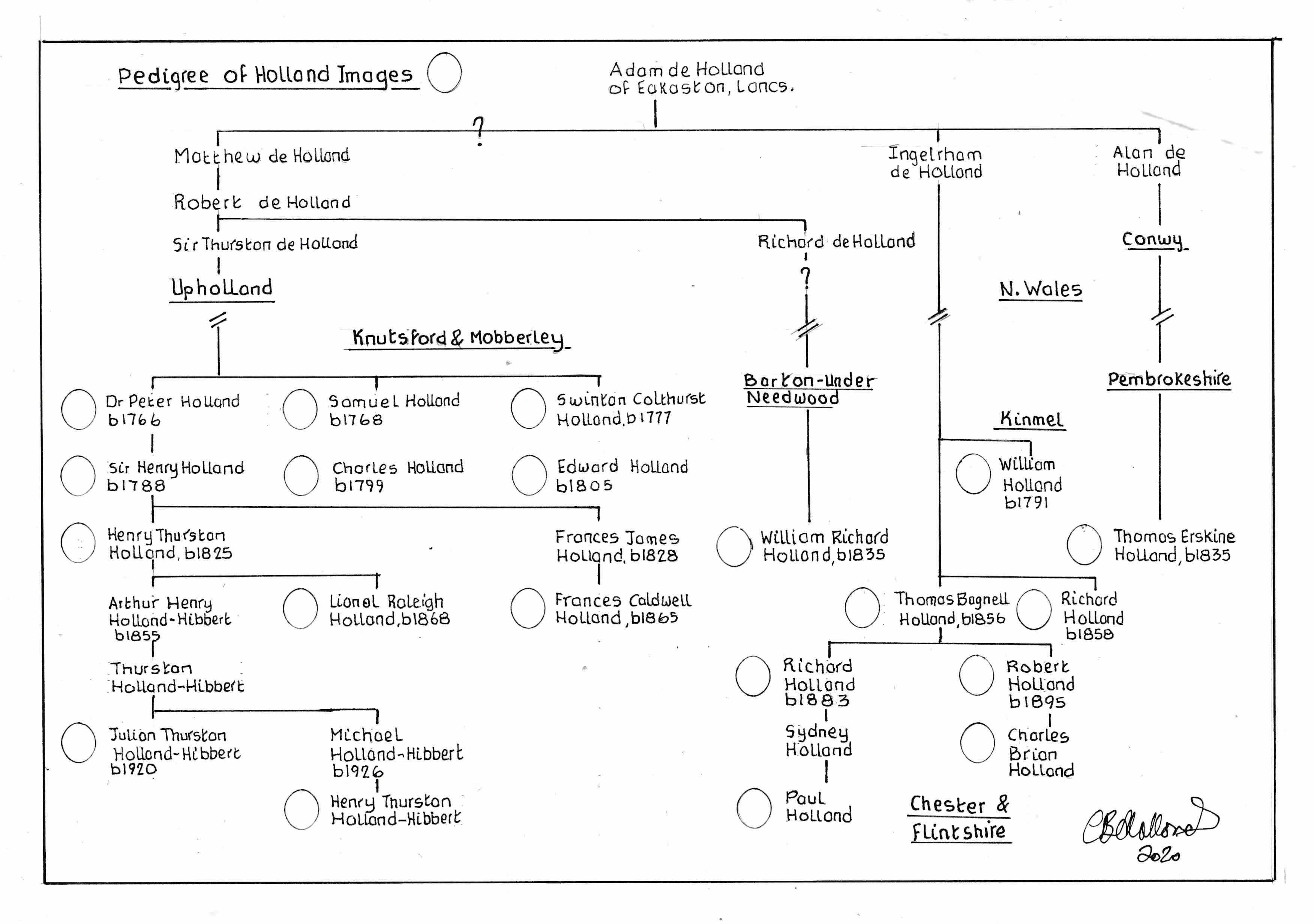 In addition to the Lancashire and Cheshire families the Hollands in N Wales are also believed to be descended from Adam de Holland of Euxton. In particular the prominent families of Eglwys Bach, Kinmel and Abergele, Plas Berw Anglesey, Llangelynnin and Newmarket are all believed to have descended from Roger Hoesgin Holland who arrived in N Wales in the mid to late 14th century. Also, the Hollands of Conwy are believed to be descended from the same Adam de Holland. Many of the descendants of Owen Holland of Newmarket, who we believe to be a descendant of Roger Hoesgyn Holland, migrated to the Wirral and Liverpool area in the mid to late 19th century.